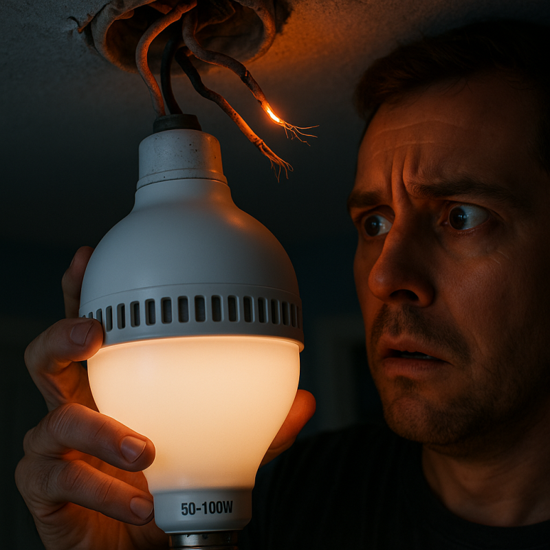 Главное заблуждение — "чем мощнее, тем лучше". В погоне за яркостью покупатели приобретают лампы на 50–100 Вт и подключают их к бытовым линиям, не рассчитанным на такую нагрузку. Это может вызвать: