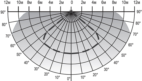 - Наиболее эффективно датчик реагирует на объект, движущийся вдоль зоны действия датчика, а не в направлении к нему или от него.
