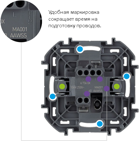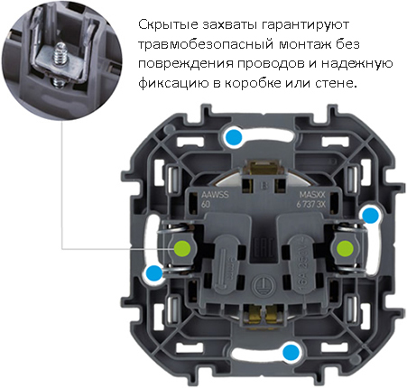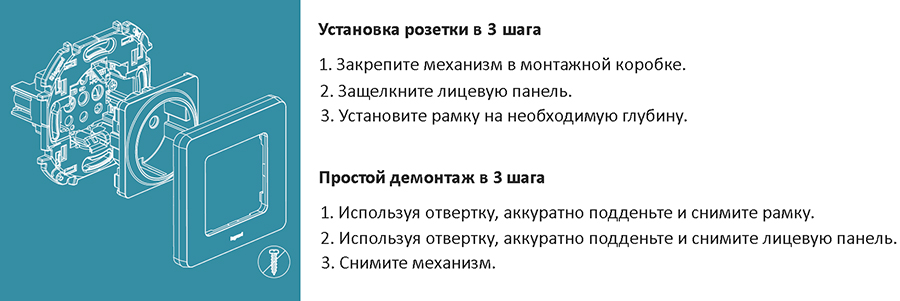 - Лицевая панель крепится без винтов на защелках, что значительно сокращает время монтажа.