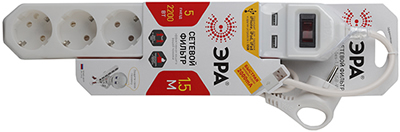 Сетевой фильтр USF-5es-1.5m-USB-W "Эра" защищает подключаемое оборудование от импульсных помех, перегрузки и короткого замыкания.