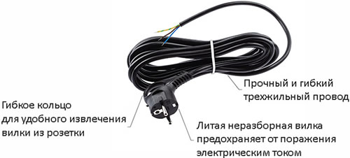 Провод шнура питания состоит из скрученных жил с надежной ПВХ оболочкой.