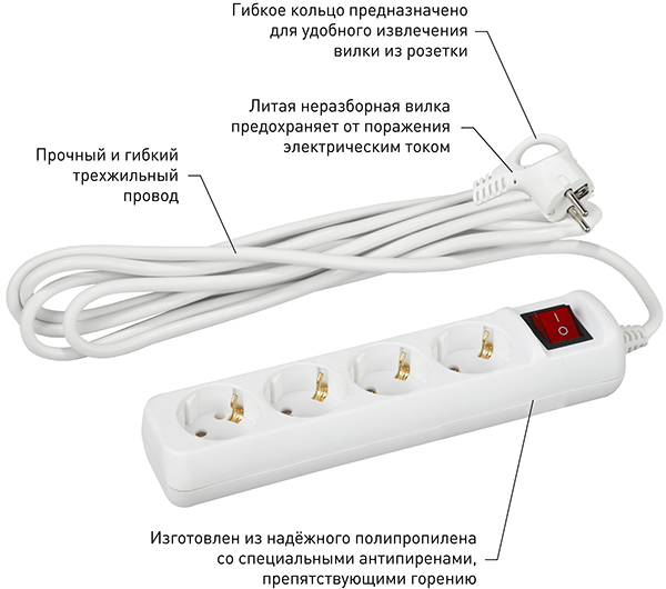 Удлинитель бытовой с заземлением предназначен для подключения электроприборов и электроинструментов мощностью до 3,5 кВт.