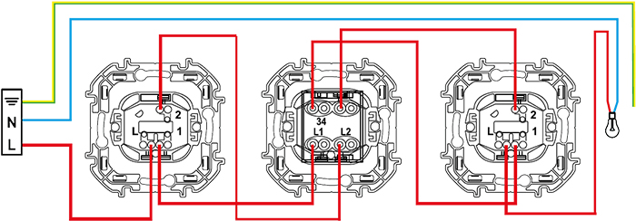Управление освещением с трех мест переключателями на два направления и промежуточным переключателем:
