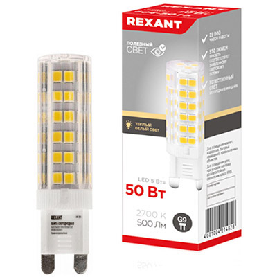 Лампа светодиодная Rexant 604-5015 JD-Corn (капсула, 220 В, G9, 5 Вт, 500 лм), цвет свечения теплый белый