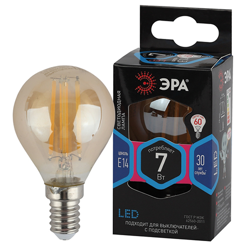 Лампа светодиодная F-LED P45-7W-840-E14 Gold "Эра" (шар, Е14, 7 Вт, 655 лм, 4000 К, золотистая колба)
