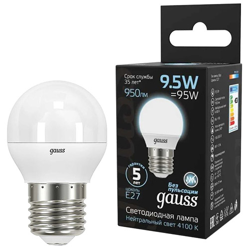 Лампа светодиодная Gauss 105102210 (G45 шар, Е27, 9,5 Вт, 950 лм, 4100 К)