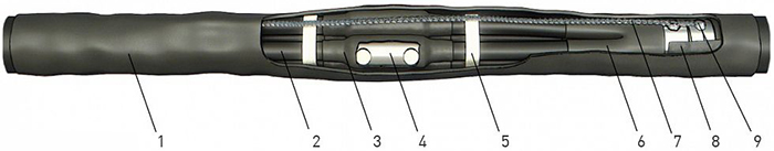 - Полную герметизацию муфты обеспечивает термоплавкий клей, нанесенный на внутренние поверхности термоусаживаемых элементов.
