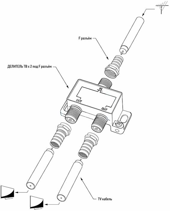 Сплиттер имеет два выхода для сигнала, подключается с помощью стандартных F-разъемов (в комплекте).