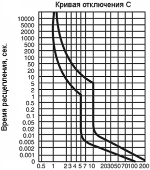 Кривая отключения отражает порог срабатывания при защите от короткого замыкания. Кривая B - автомат срабатывает при появлении в цепи тока в 3 - 5 раз больше номинального (то есть автомат на 16 А отключит цепь при токе 48 - 80 А). Кривая С - ток в цепи в 5 - 10 раз больше номинального (то есть автомат на 16 А отключит цепь при токе 80 - 160 А). Кривая D - ток в цепи в 10 - 14 раз больше номинального (то есть автомат на 16 А отключит цепь при токе 160 - 224 А). |