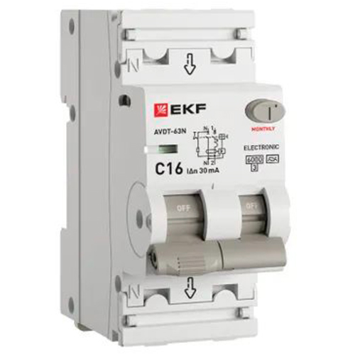 Автоматический выключатель дифференциального тока АВДТ-63N 1P+N 16А EKF PROxima (16 А, характеристика C, тип A электронный, 30 мА, 6 кА)