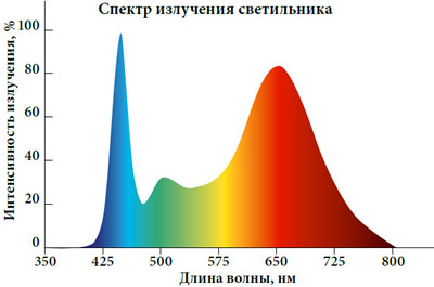 Светильник обладает уникальным спектральным составом света, повторяющим спектр, необходимый для фотосинтеза растений.
