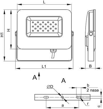 - Монтаж прожектора производится путем крепления скобы на монтажную поверхность при помощи двух крепежных элементов (анкеры, болты или шпильки с гайками, плоскими и пружинными шайбами - в комплект не входят).