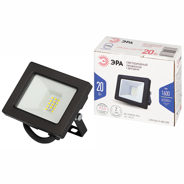 Прожектор светодиодный LPR-042-3-65K-020 "Эра" (20 Вт, 1600 лм, 6500 К, IP65) со встроенным фотореле, черный